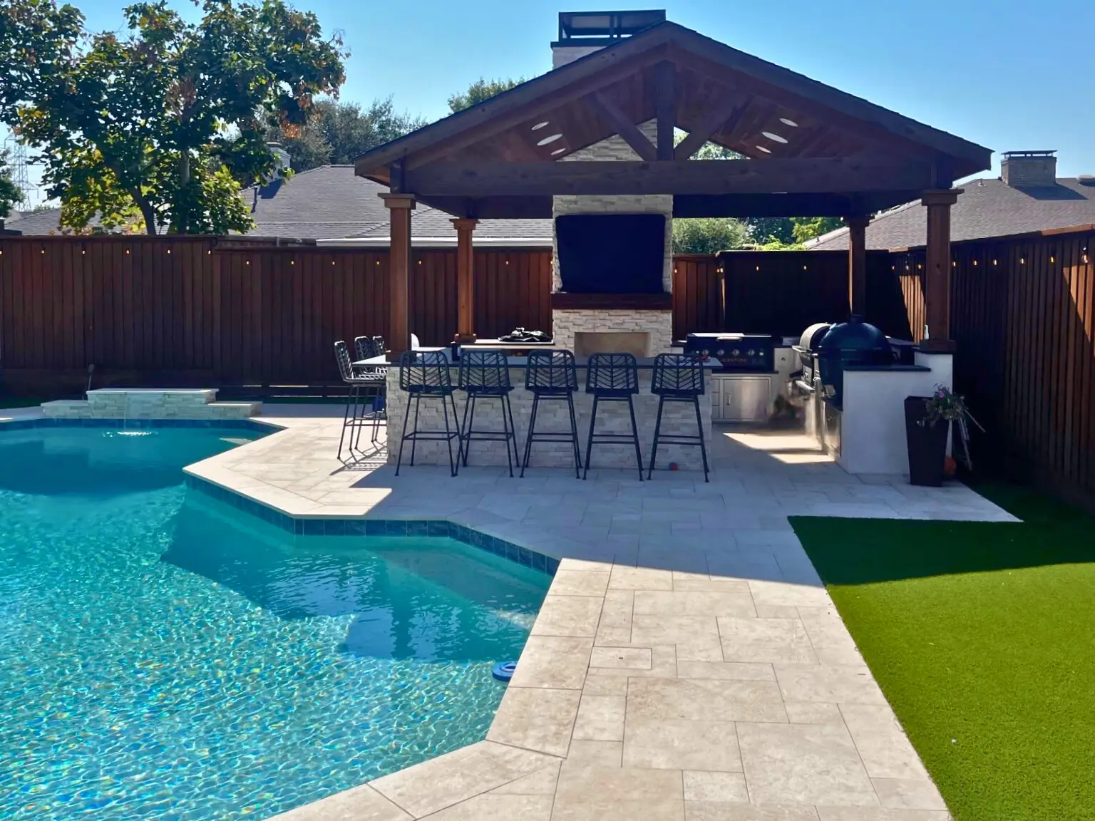 From concept through construction, our team managed every detail: permits, engineering, tile selection, travertine coping, smart automation, and LED lighting.